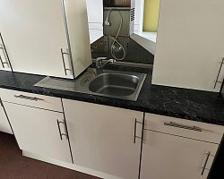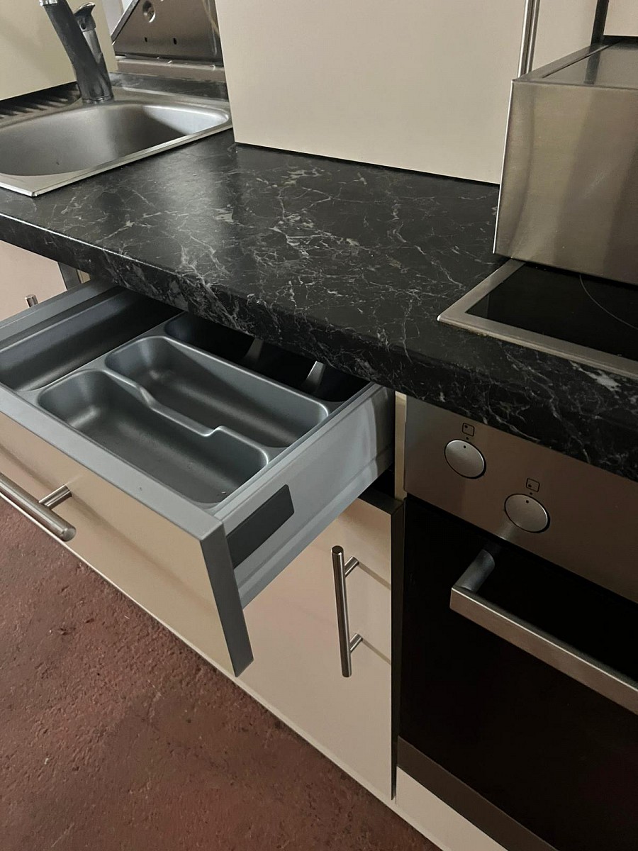 Součástí: Horkovzdušná trouba, sklokeramická deska, digestoř, lednice, dřez a baterie
