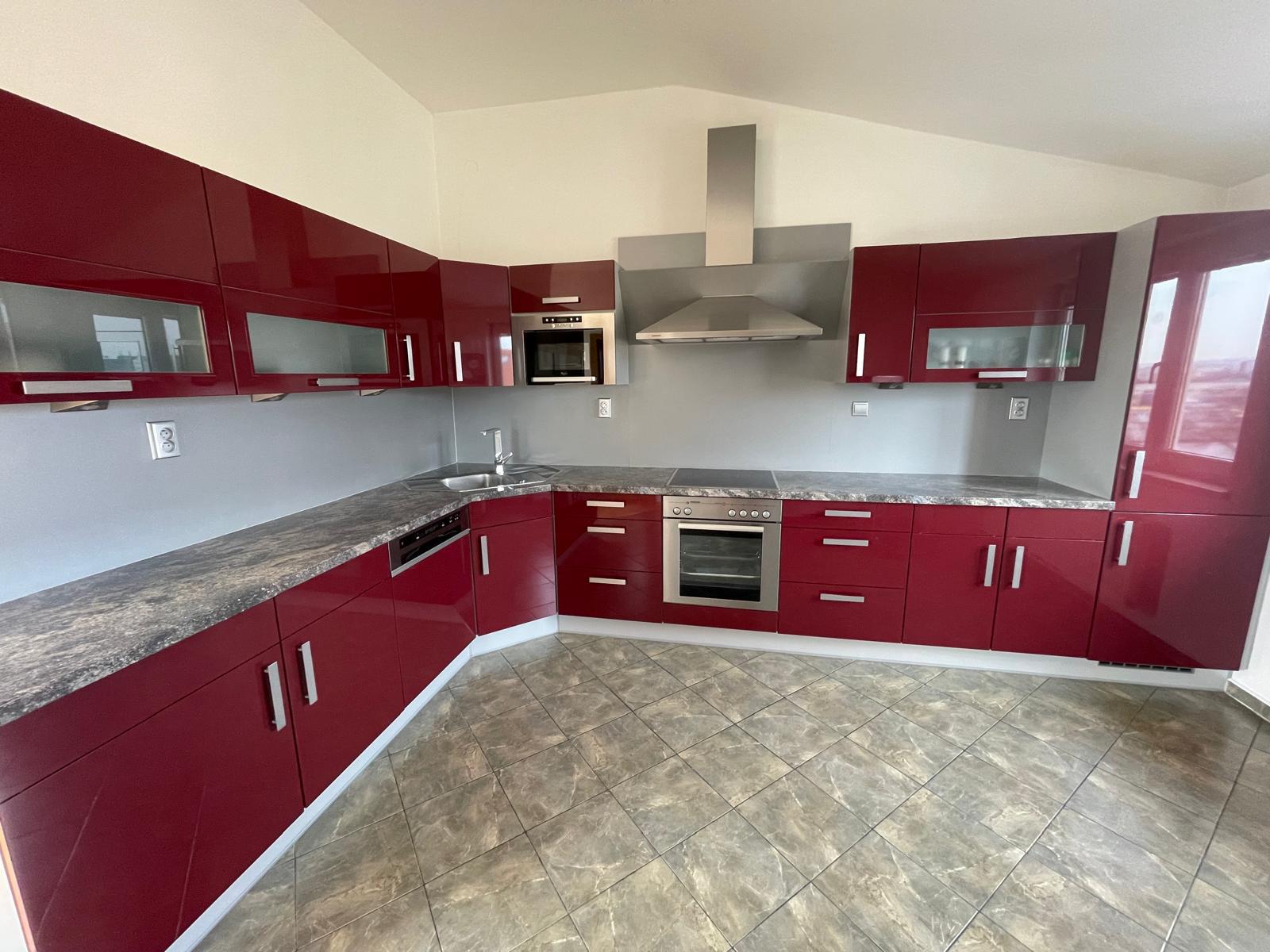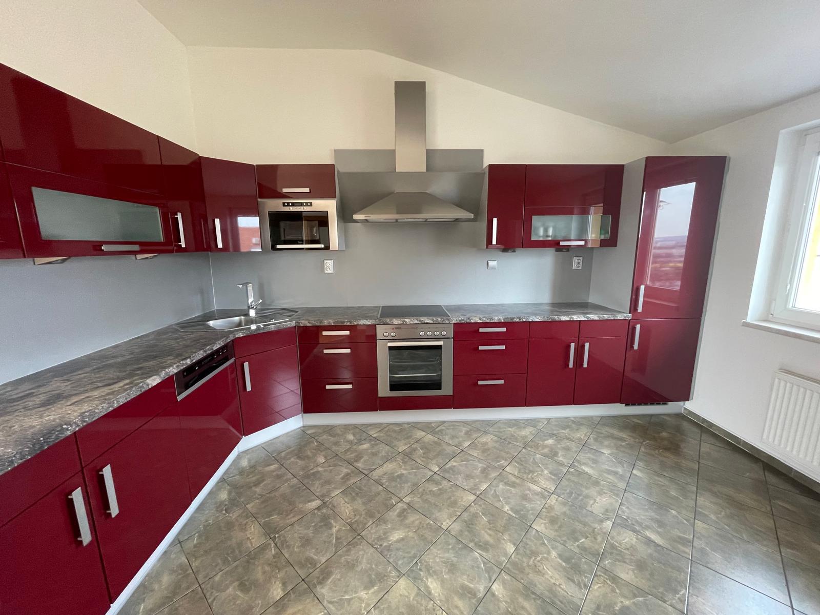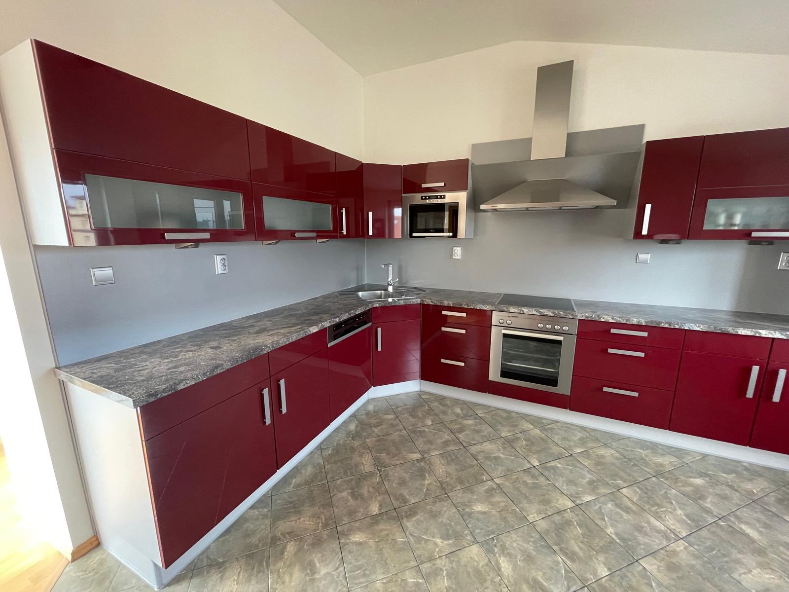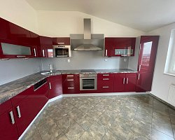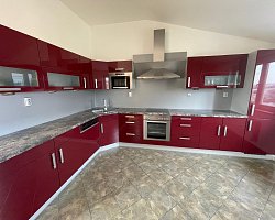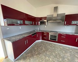 Moderní červená kuchyň v lesku se všemi spotřebiči.