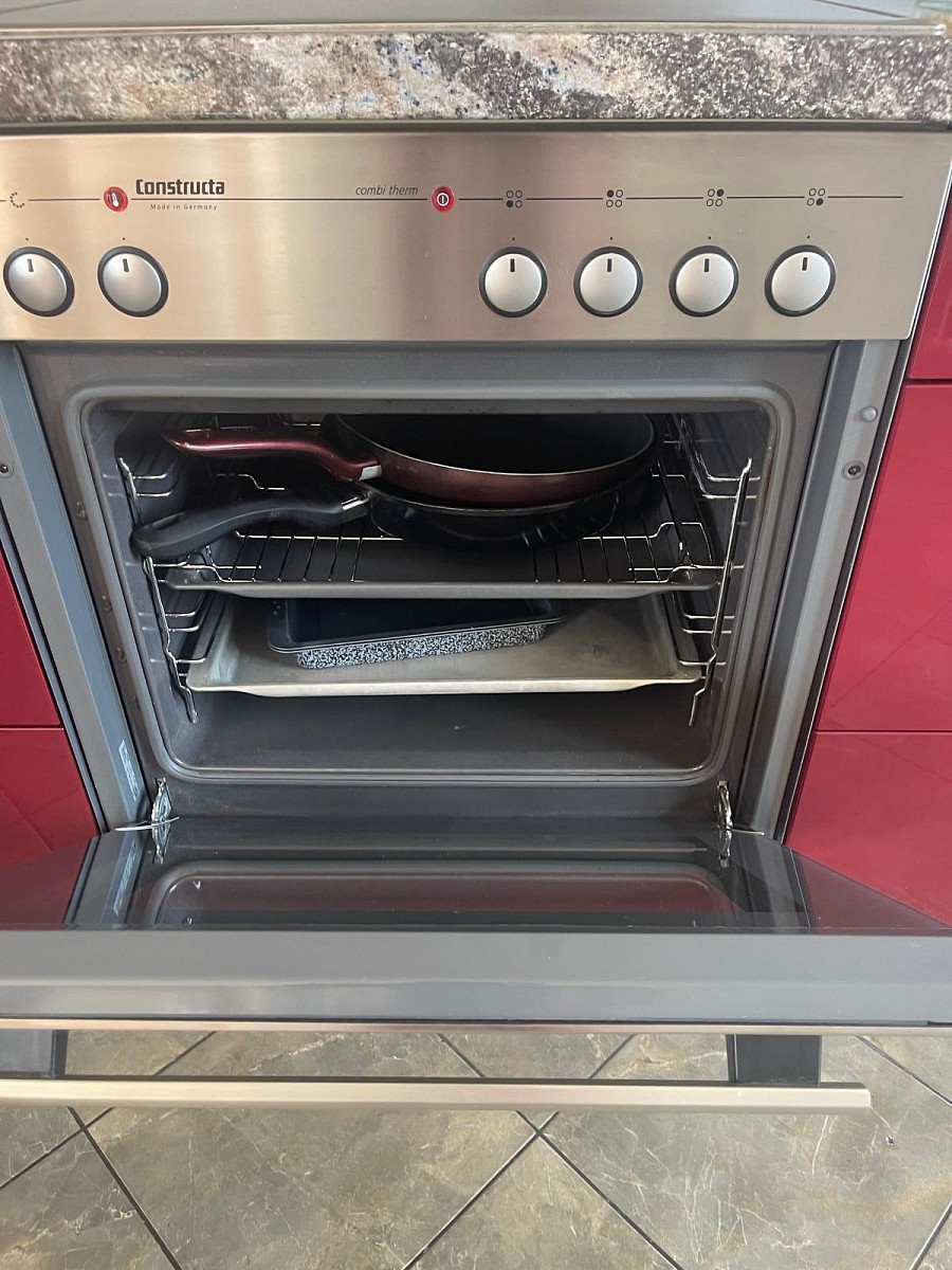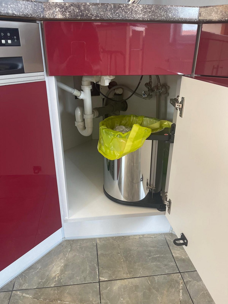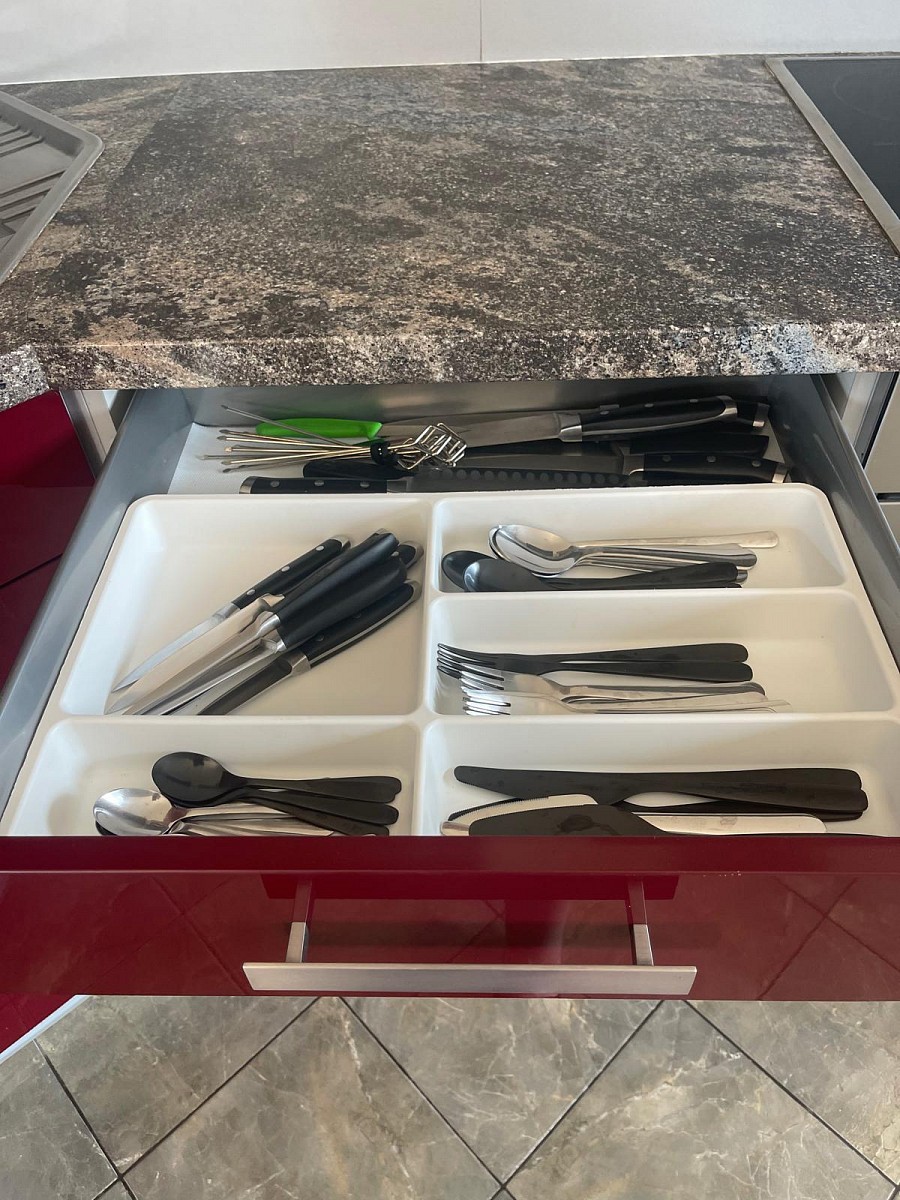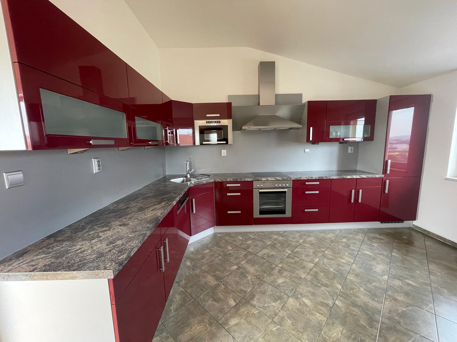 Moderní červená kuchyň v lesku se všemi spotřebiči.